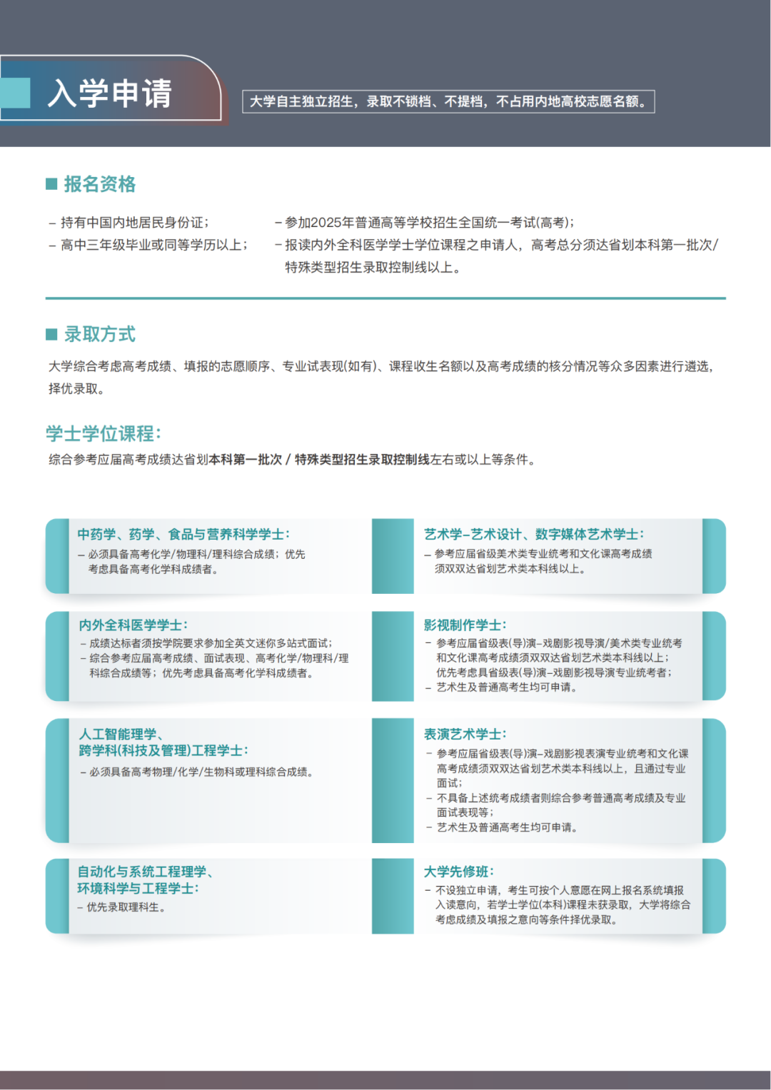 考生必须为持有中国内地居民身份证的高中毕业生;参加2025年普通高等学校招生全国统一考试 (普通高考),总成绩达到其所在省划本科第一批次/特殊类型招生录取控制线左右或以上。3
