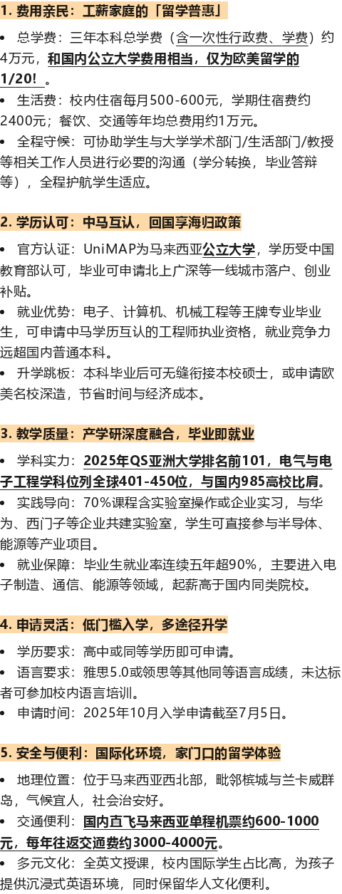 马来西亚玻璃市大学(UniMAP)中国办公室为您带来一份「高性价比留学方案」——三年制本科、中马学历互认、总费用仅需3.7万元起,助您用更低的成本为孩子铺就更广阔的未来!