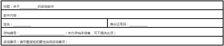 答:邮件正文发送以下格式的咨询问题到dangan@cscse.edu.cn,收到自动回复说明发送成功,我处3个工作日内予以答复。如未收到自动回复,建议更换邮箱再次发送。