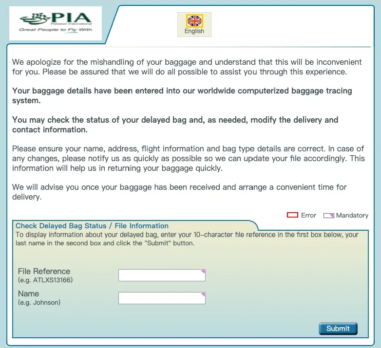 这份报告是记录行李丢失情况的官方文件,也是你后续追踪和索赔的重要凭证。务必妥善保管好PIR报告的副本,上面会有一个唯一的查询编码(File Reference Number)。